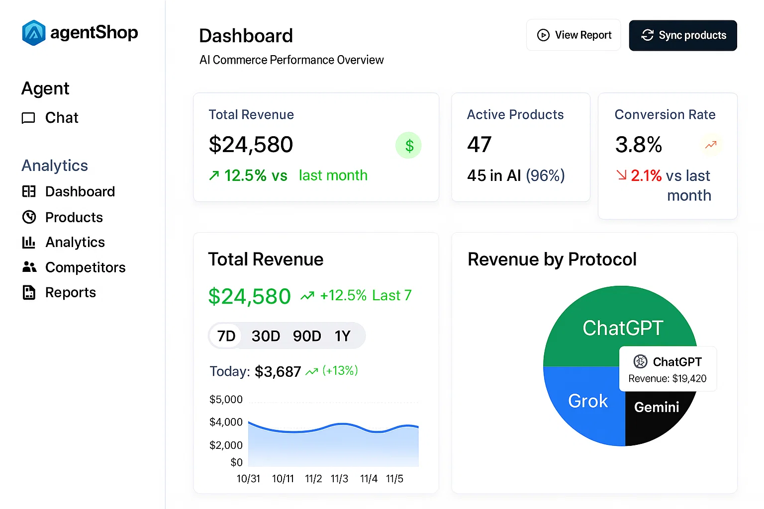 AI rankings change constantly. agentShop tracks your visibility across all major AI assistants day-by-day, showing when you're gaining ground or when competitors jump ahead.