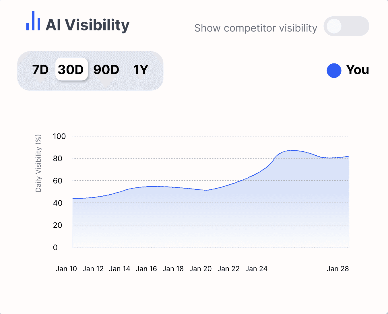 Your dashboard becomes a live control panel for AI visibility. Track brand visibility, AI mentions, average position, and conversion rates— All benchmarked against competitors.