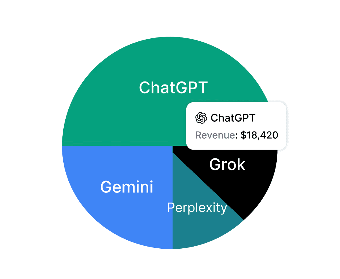 See which AI channels actually drive sales. Revenue is broken down by assistant—ChatGPT, Gemini, Grok, Perplexity—so you know where to double down and where to fix leaks.